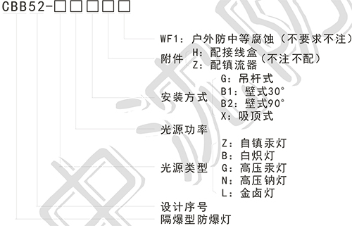 > 按照產(chǎn)品型號規(guī)格說明逐條選擇并注明防爆標志,例如:需要金鹵燈 100W,吸頂式安裝則產(chǎn)品選型為:CBB52-L100X ExdⅡBT4;