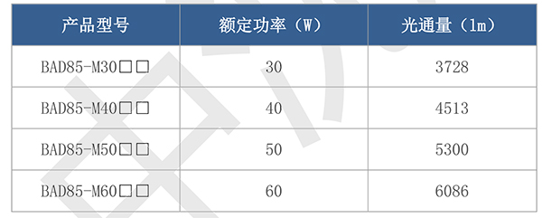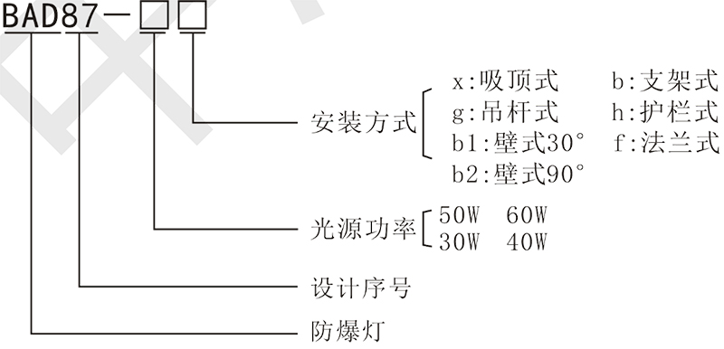 > 按照產(chǎn)品型號(hào)規(guī)格說明逐條選擇并注明防爆標(biāo)志,例如:需要防爆 LED 燈 50W 規(guī)格,吸頂式安裝,則產(chǎn)品型號(hào)為 BAD87-50x ExdembⅡCT5 Gb。